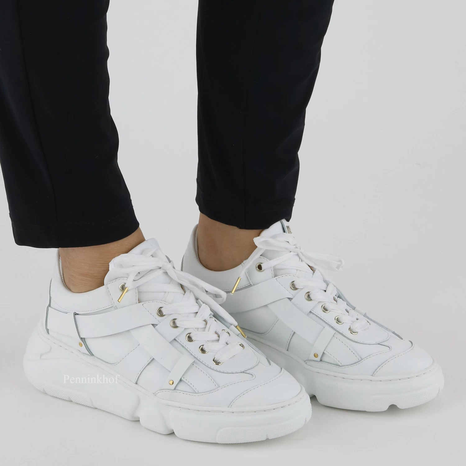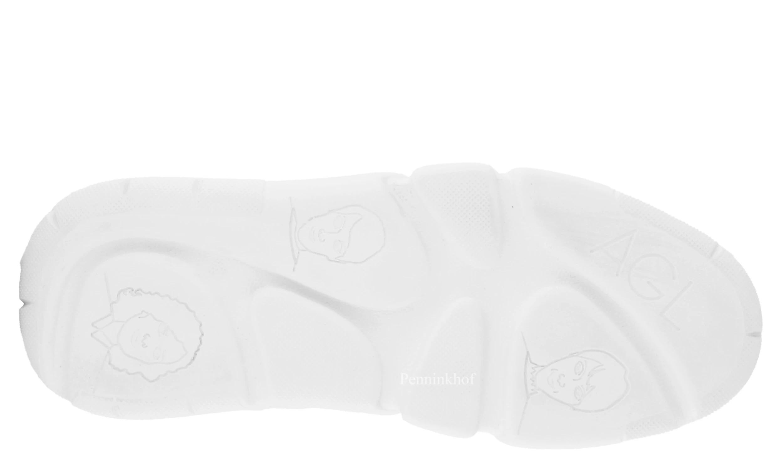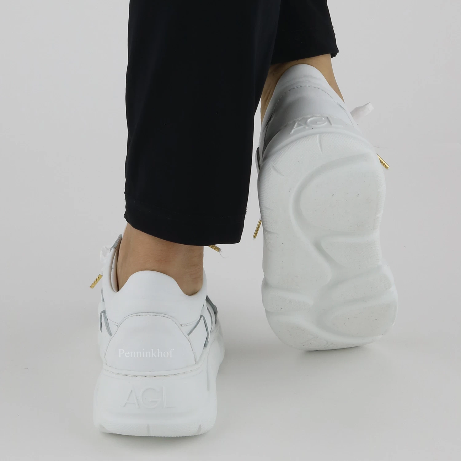 Een sneaker van AGL in de kleur wit. De sneaker is decoratief gevlochten. De veters zijn in een witte mat satijnen stof. De sneaker heeft een design zool en de binnenkant is met leder gevoerd.