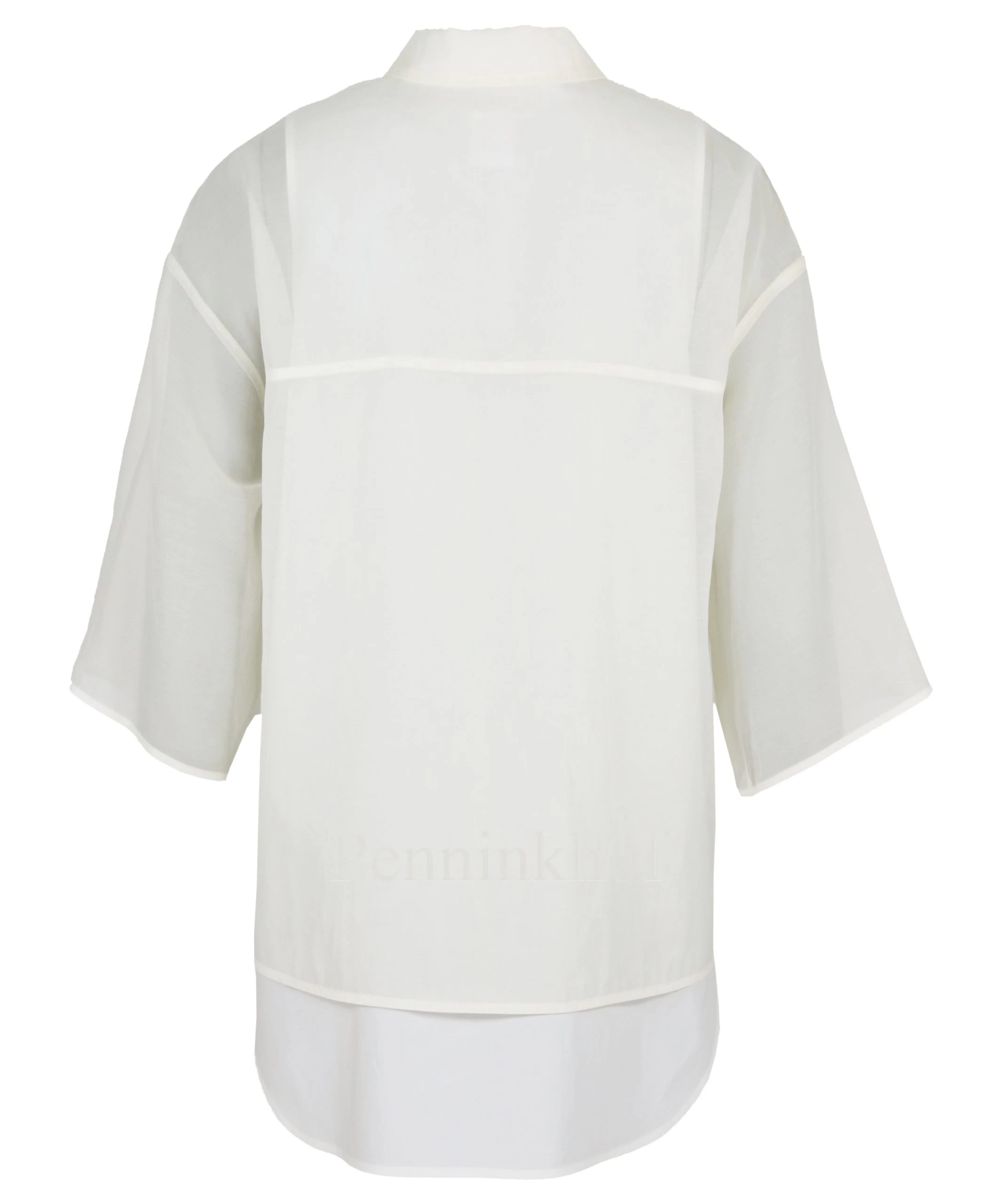 Een luxe blouse van Annette Görtz met een dubbele stof in een roomwitte kleur. De buitenste stof is transparanten aan de onderkant 10 cm korten als de onderste stof. De blouse heeft halflange mouwen. deze blouse mag op de hand worden gewassen.
