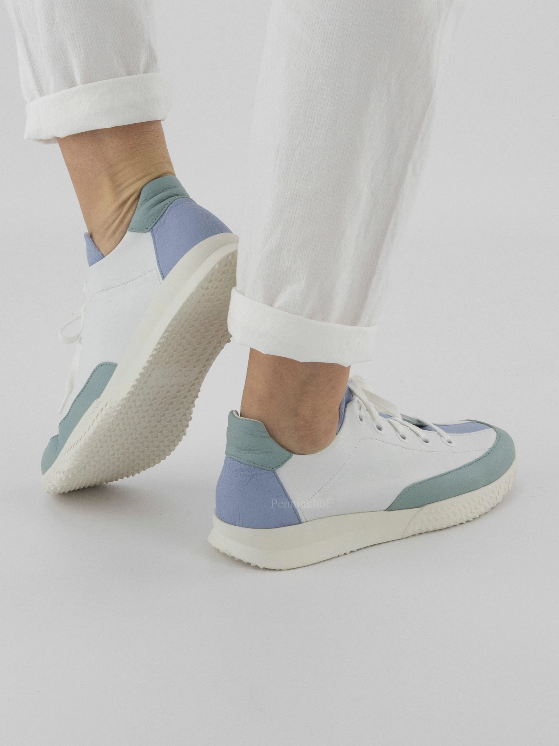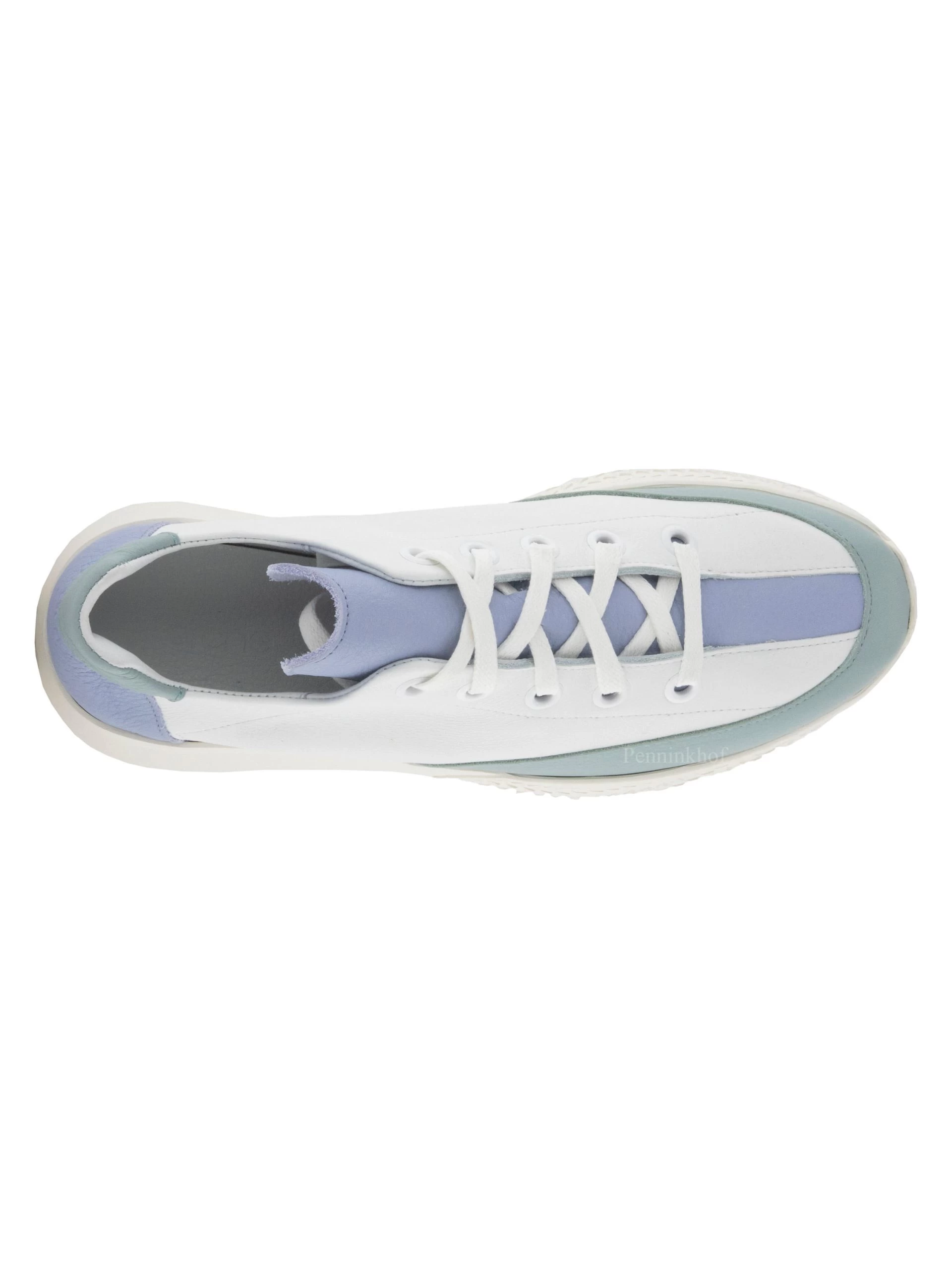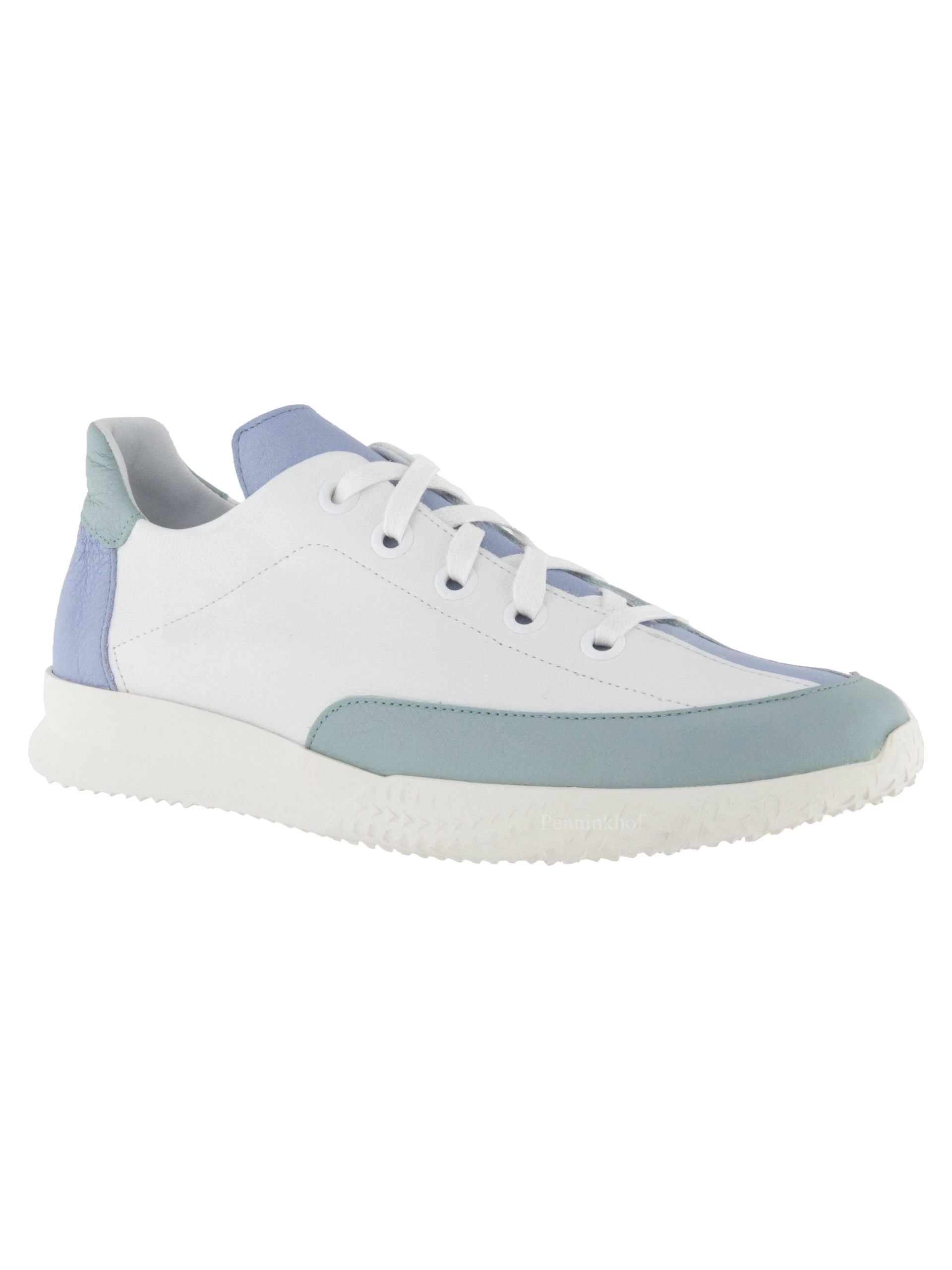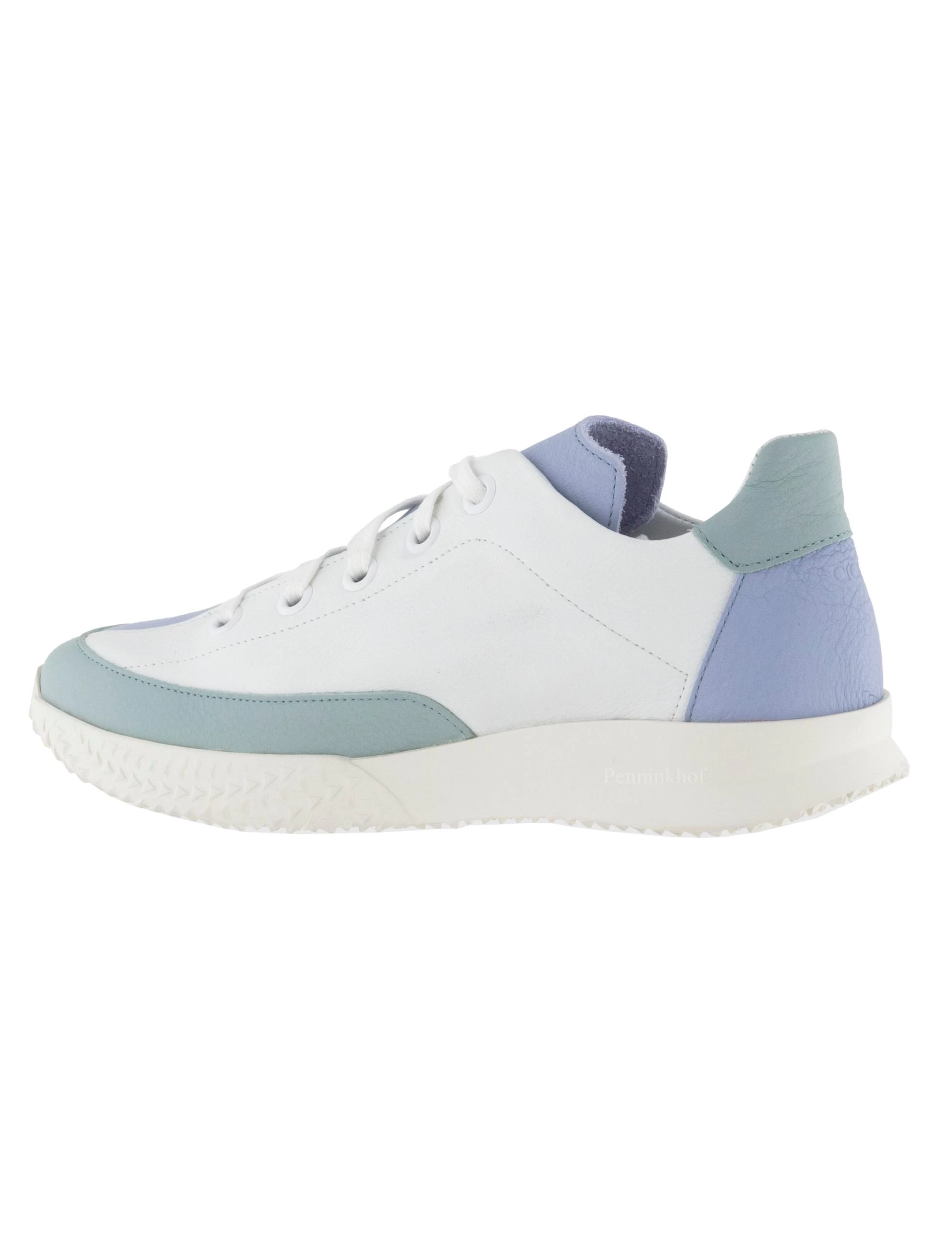 Een sneaker van Arche in de kleur wit. Langs de rand van de voorvoet tot halverwege de sneaker is een pastel blauwgrijs kleurige nubuck bies. De hiel is in een pastel lila kleur met aan de bovenzijde een blauwgrijze top. De witte zool is decoratief driehoekig gekarteld.