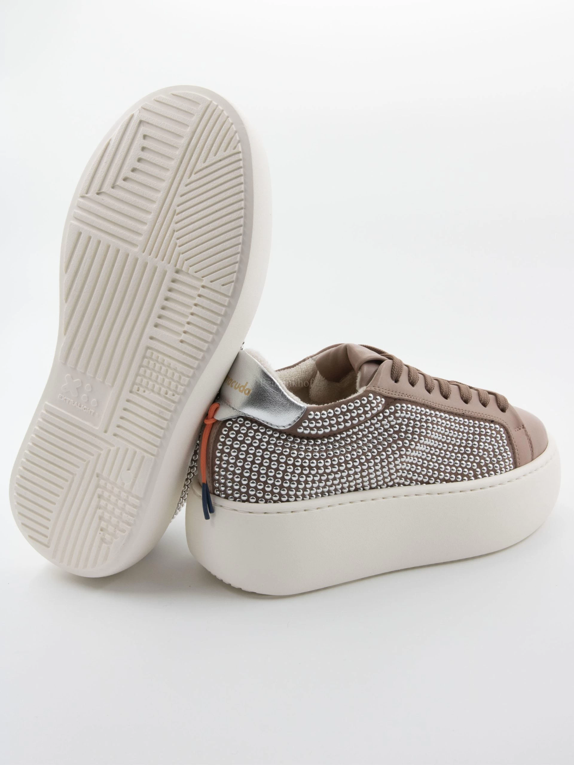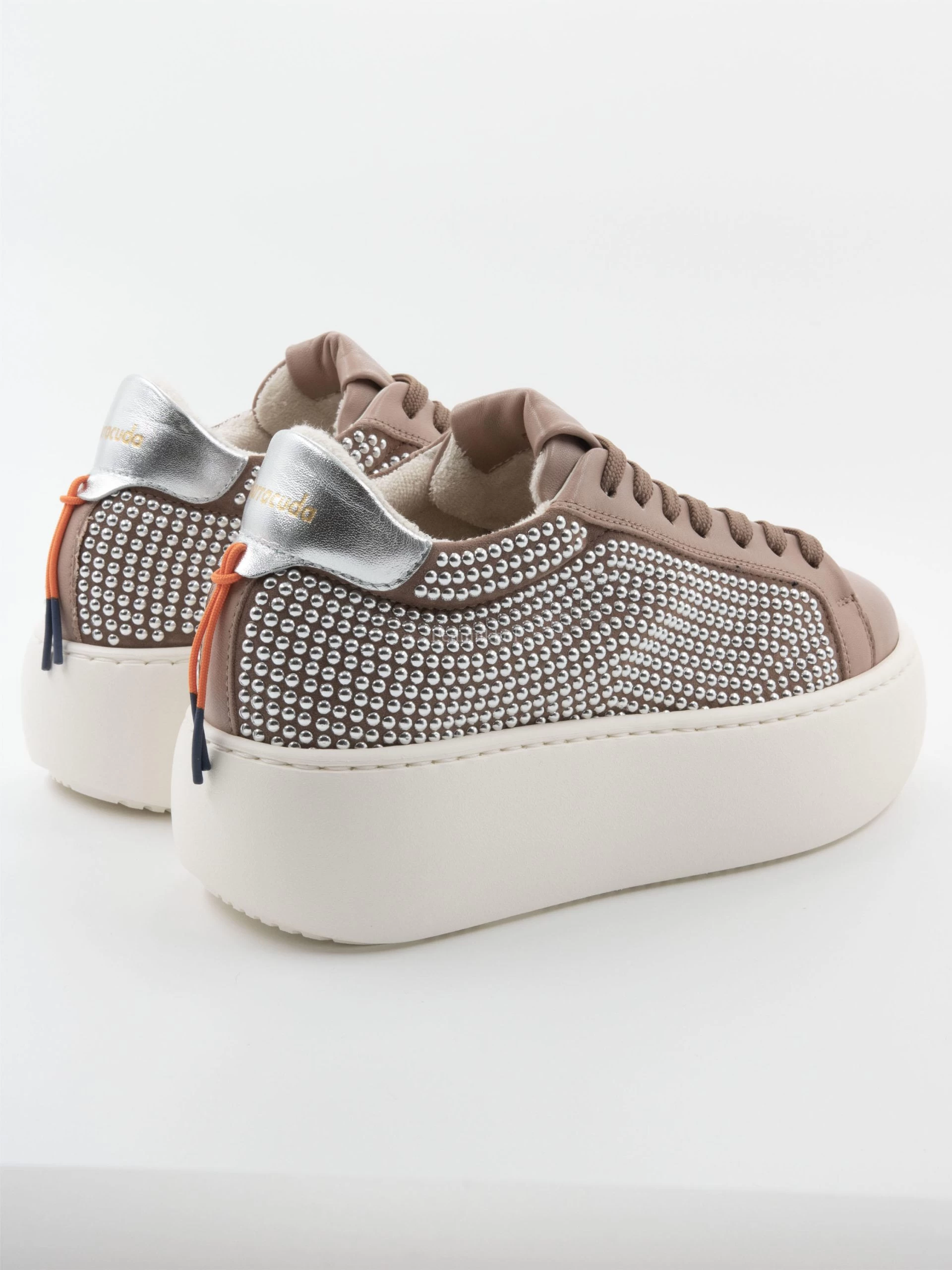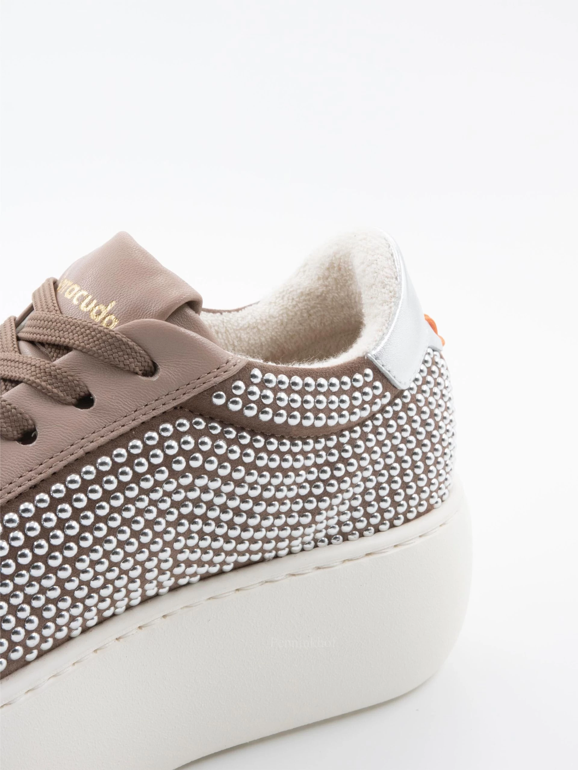 Een luxe sneaker van Barracuda in nude kleur. Langs de zijkanten is de sneaker bekleed met zilverkleurige studs. De plateauzool is in de kleur roomwit. De binnenkant is gevoerd.