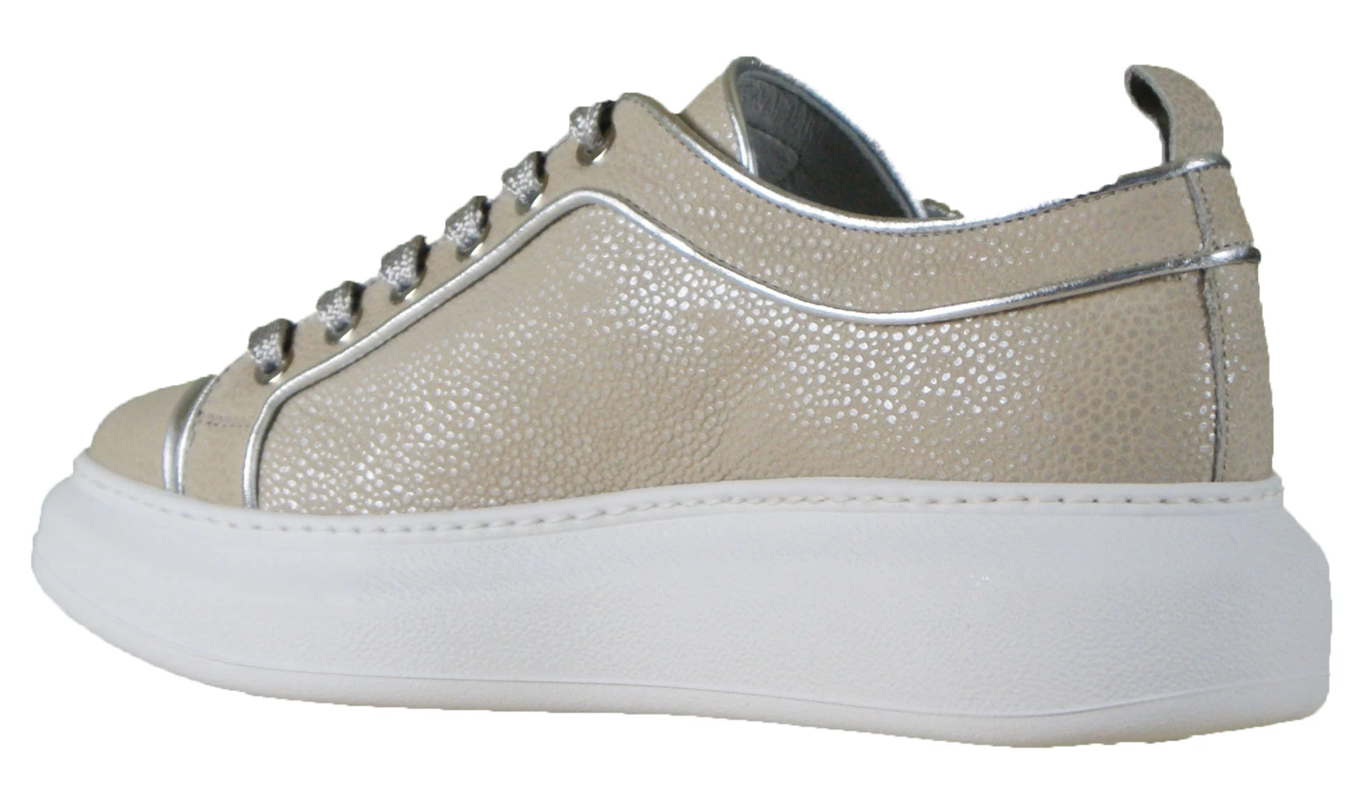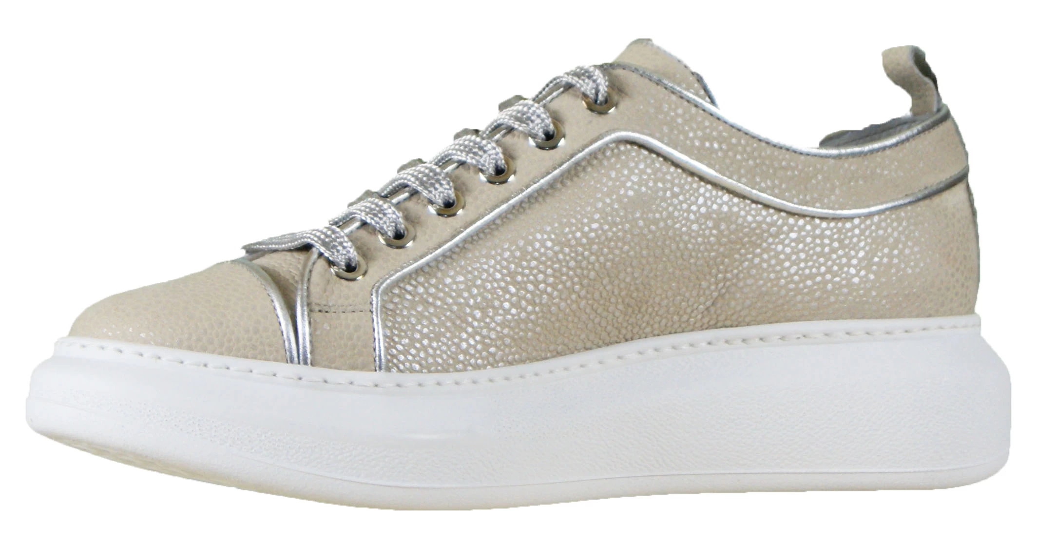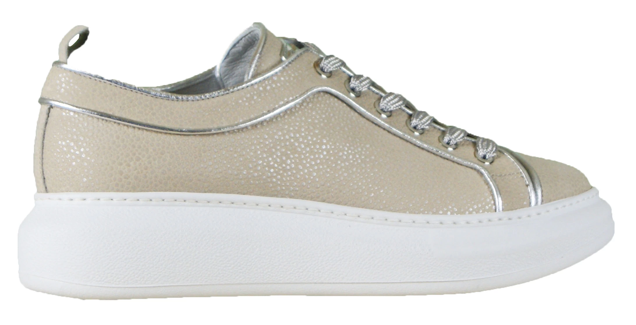 Een sneaker of veterschoen van het merk Barracuda in een beige kleur met zilver. Over de ronde neus loopt een zilveren bies. Dit detail komt terug vanaf de zijkanten langs de veters naar de hiel toe. De sneaker heeft een witte plateau zool.
