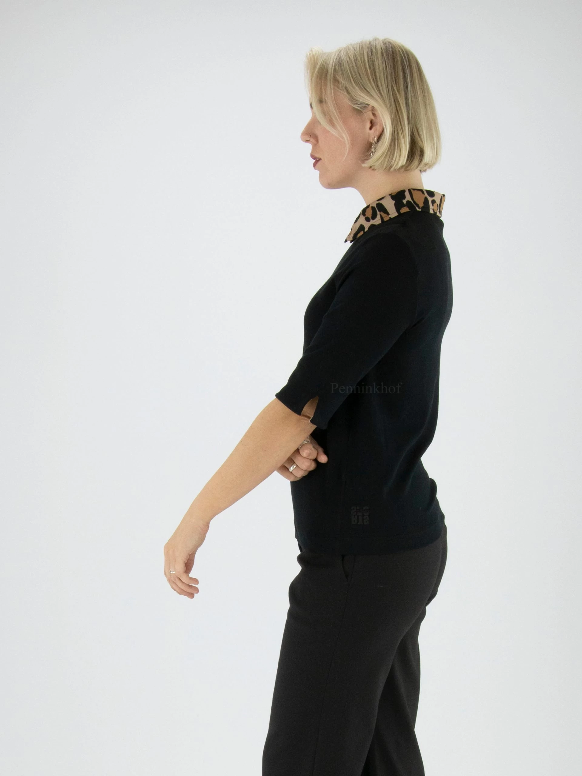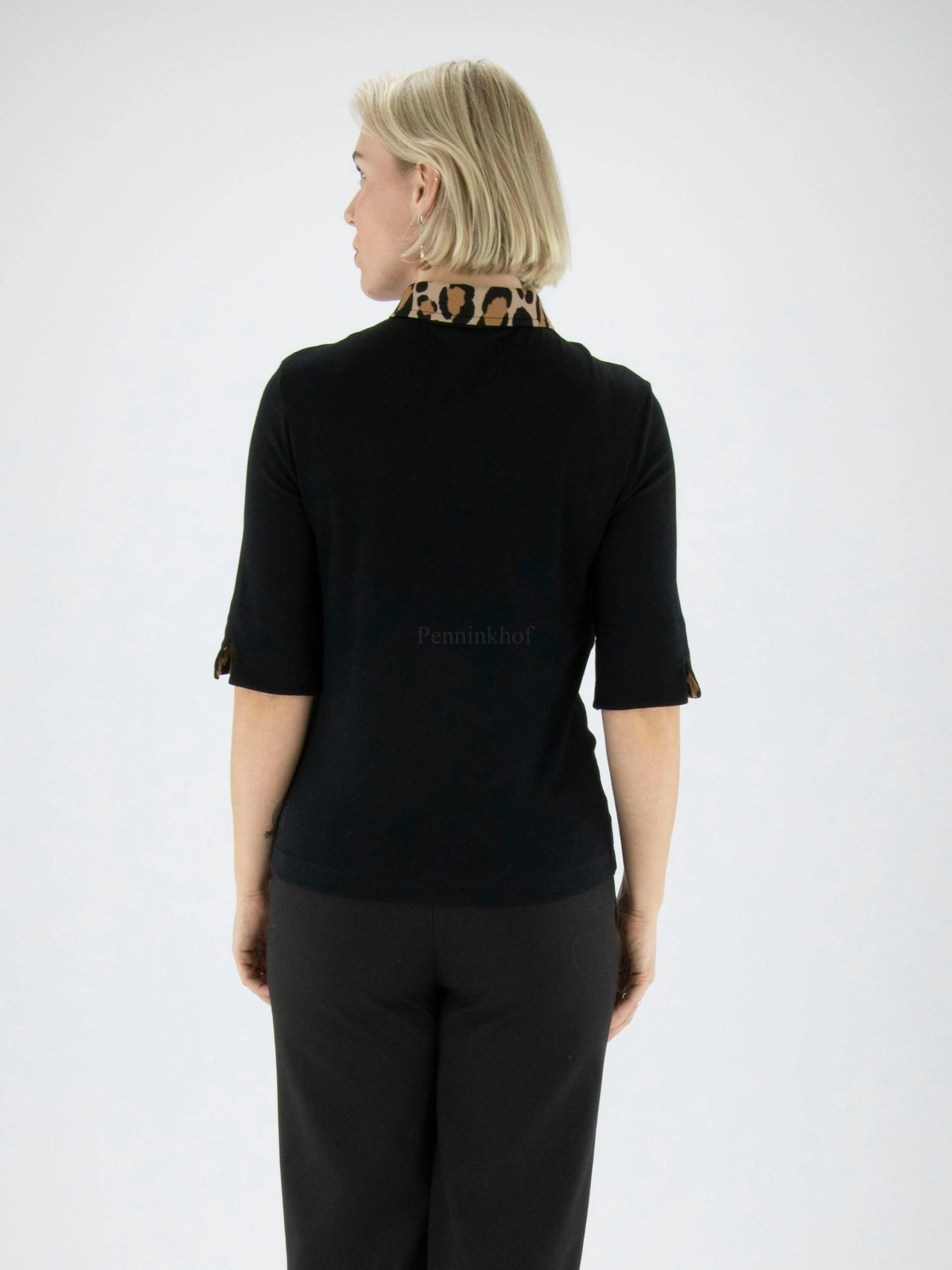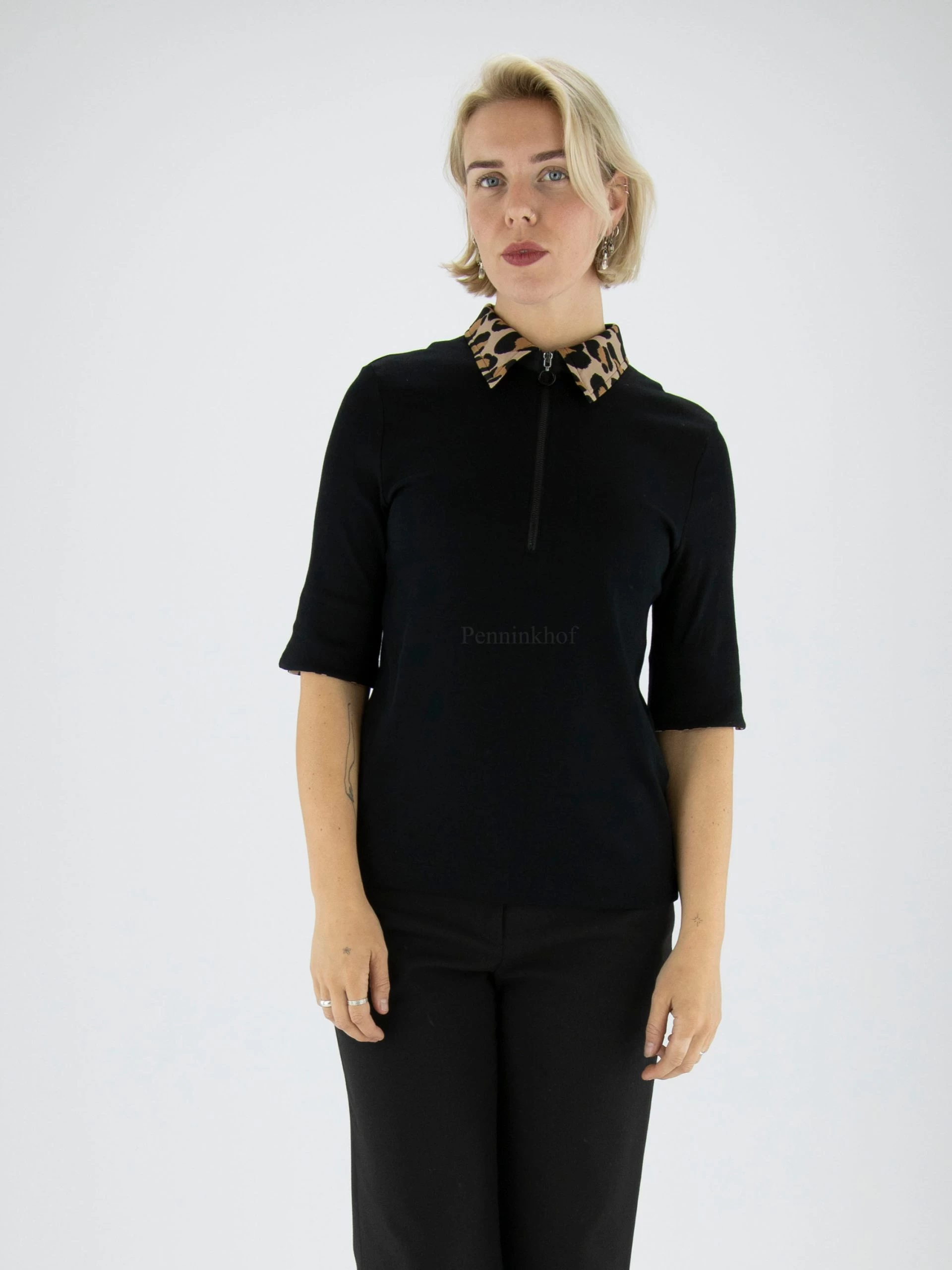 Een polo shirt van Marc Cain in de kleur zwart. De kraag is in een panterprint met meerdere tinten bruin met zwart. Vanuit het midden van de hals is een rits tot aan de buste. Aan het uiteinde van de korte mouwen is een omslag met een panterprint en een splitje. Dit shirt mag op 30 graden worden gewassen.