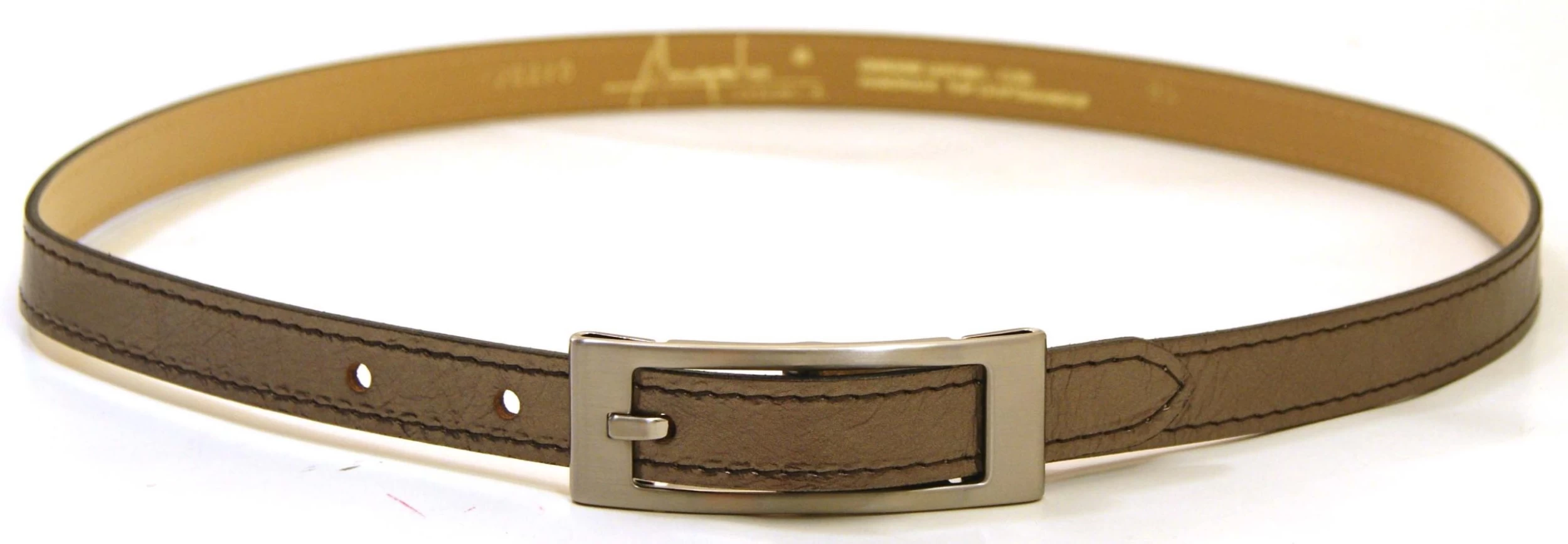 Een smalle ceintuur van het merk Angelo de Lombardi. De ceintuur is 2 cm breed en aan de zijkanten afgestikt. De gesp is van nikkel. De maten van de ceintuur lopen van 85 cm tot en met 105 cm.